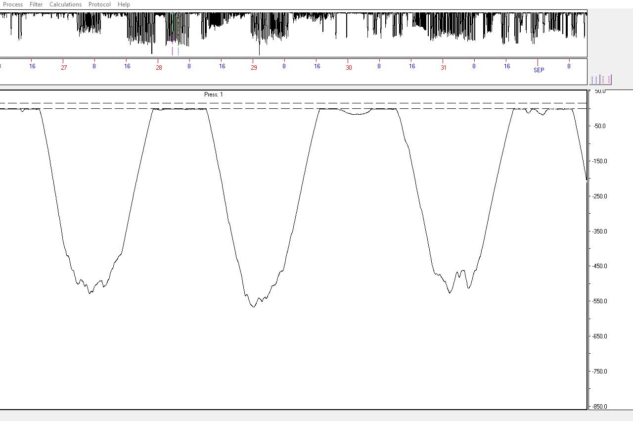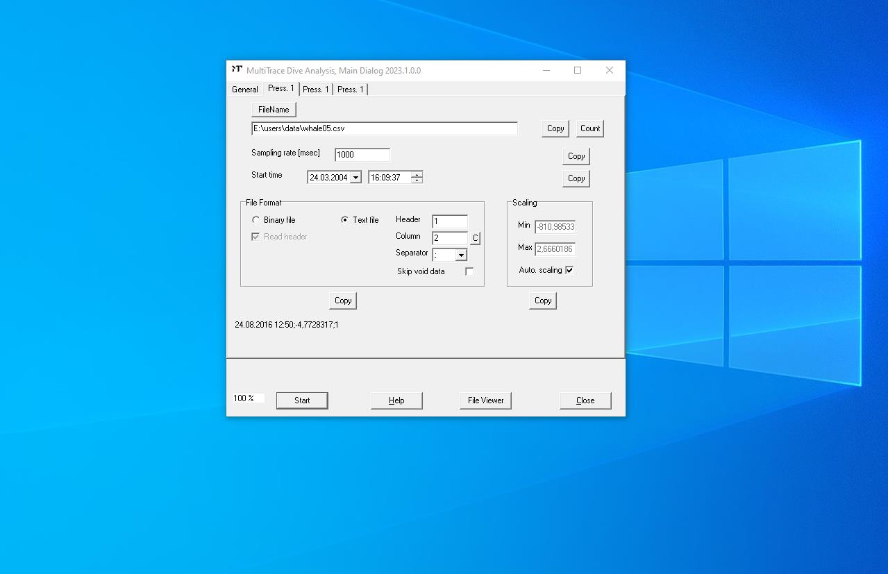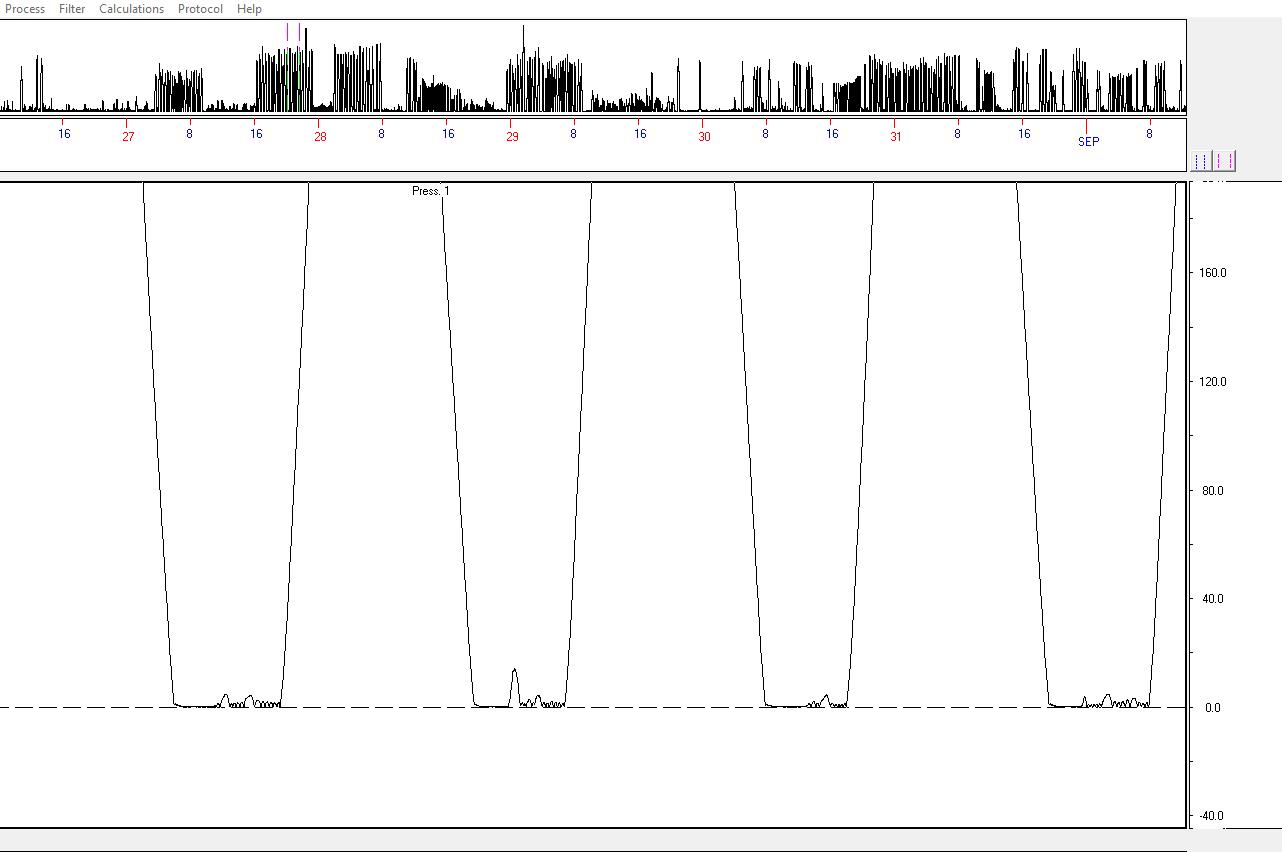 Put the work cursors back to the top of the channel (F4 Home, F5 Home-key), press the Q key once to find the first dive, then press the W key. This analyses the current dive event and writes the results of the analysis to the output file. Then 'W' key again until the end of the file.