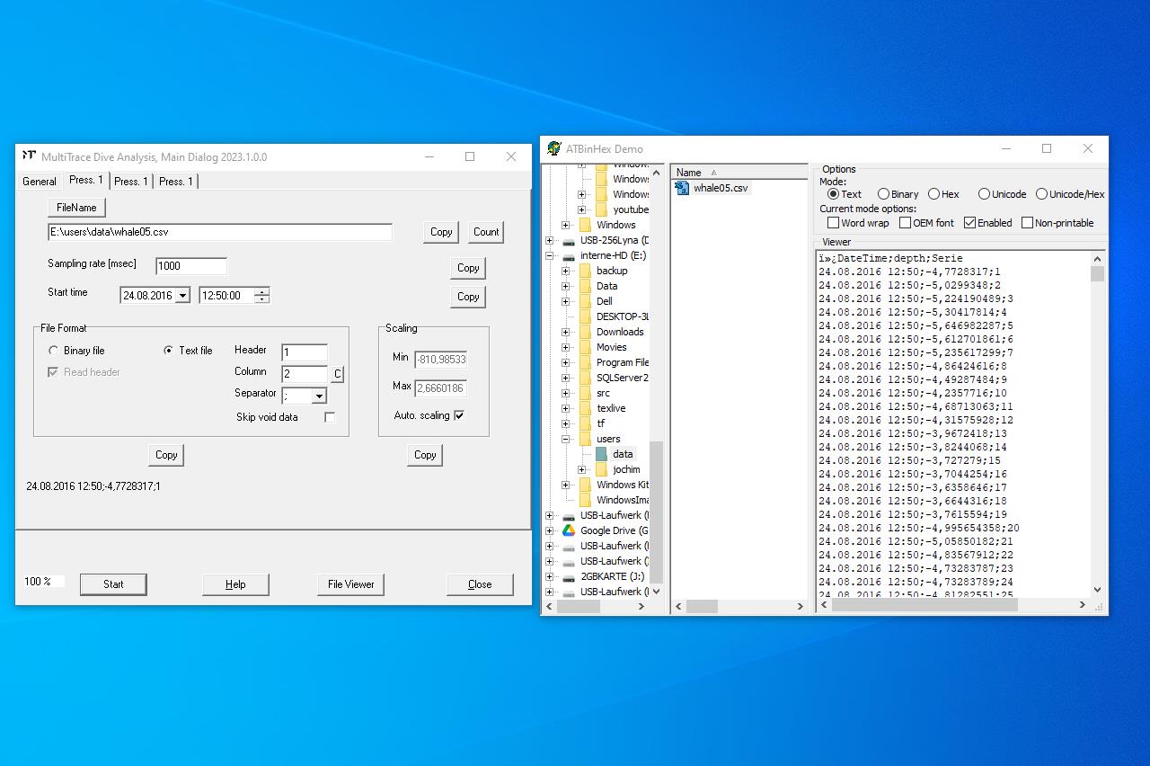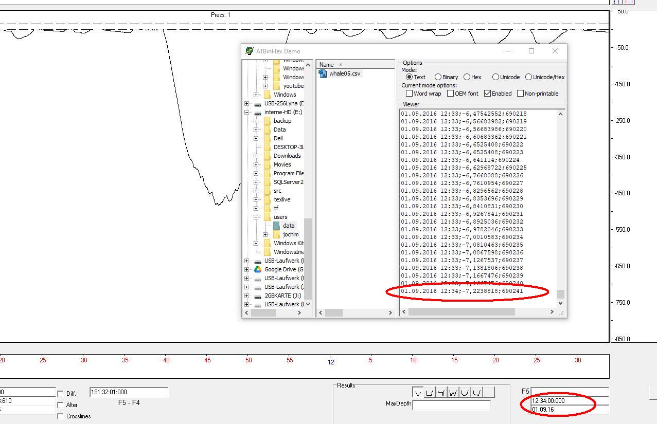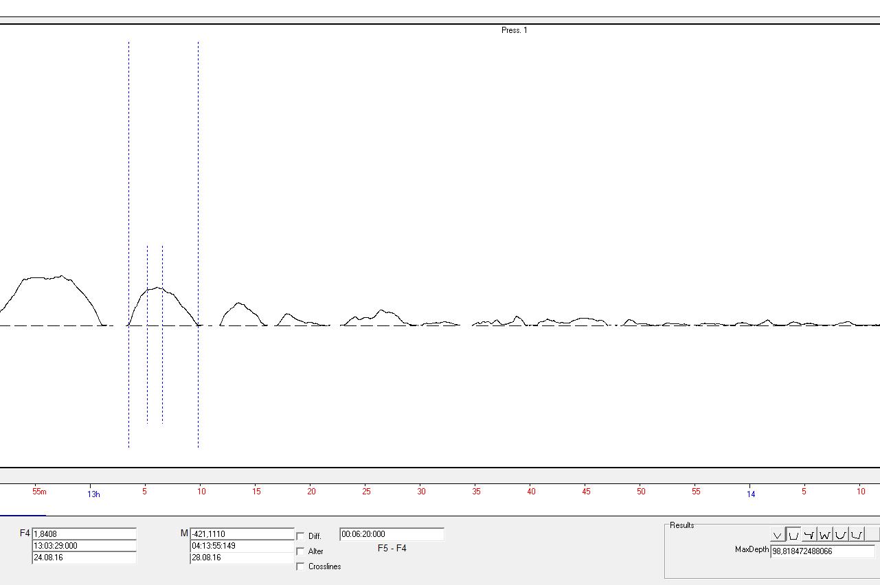 Testphase: Put the work cursors back to the onset of the channel (F4 Home, F5 Home-key) and press the Q key repeatedly to test if MT finds the dives. If necessary, change the parameters (Menu Analysis/Parameter).