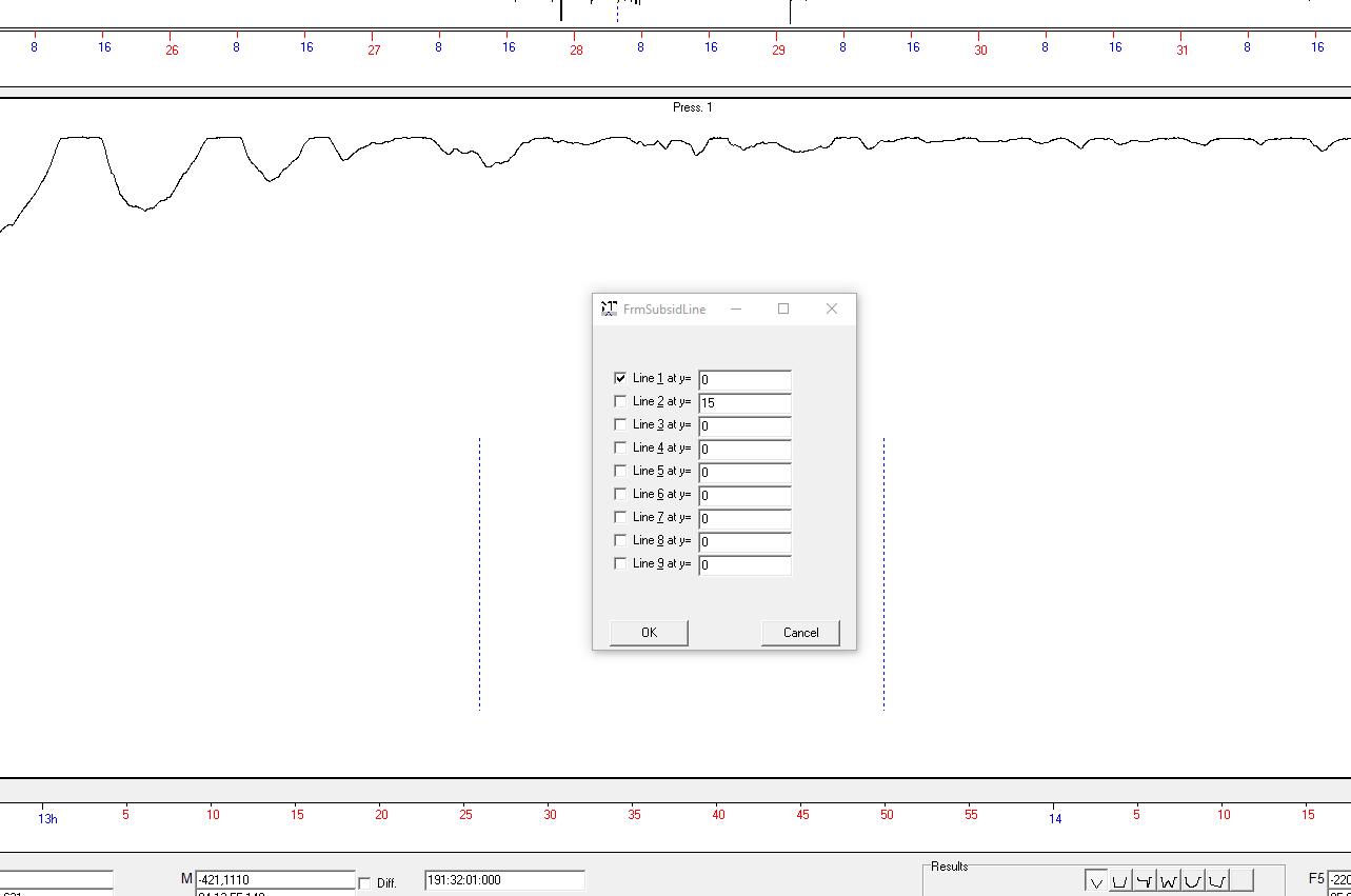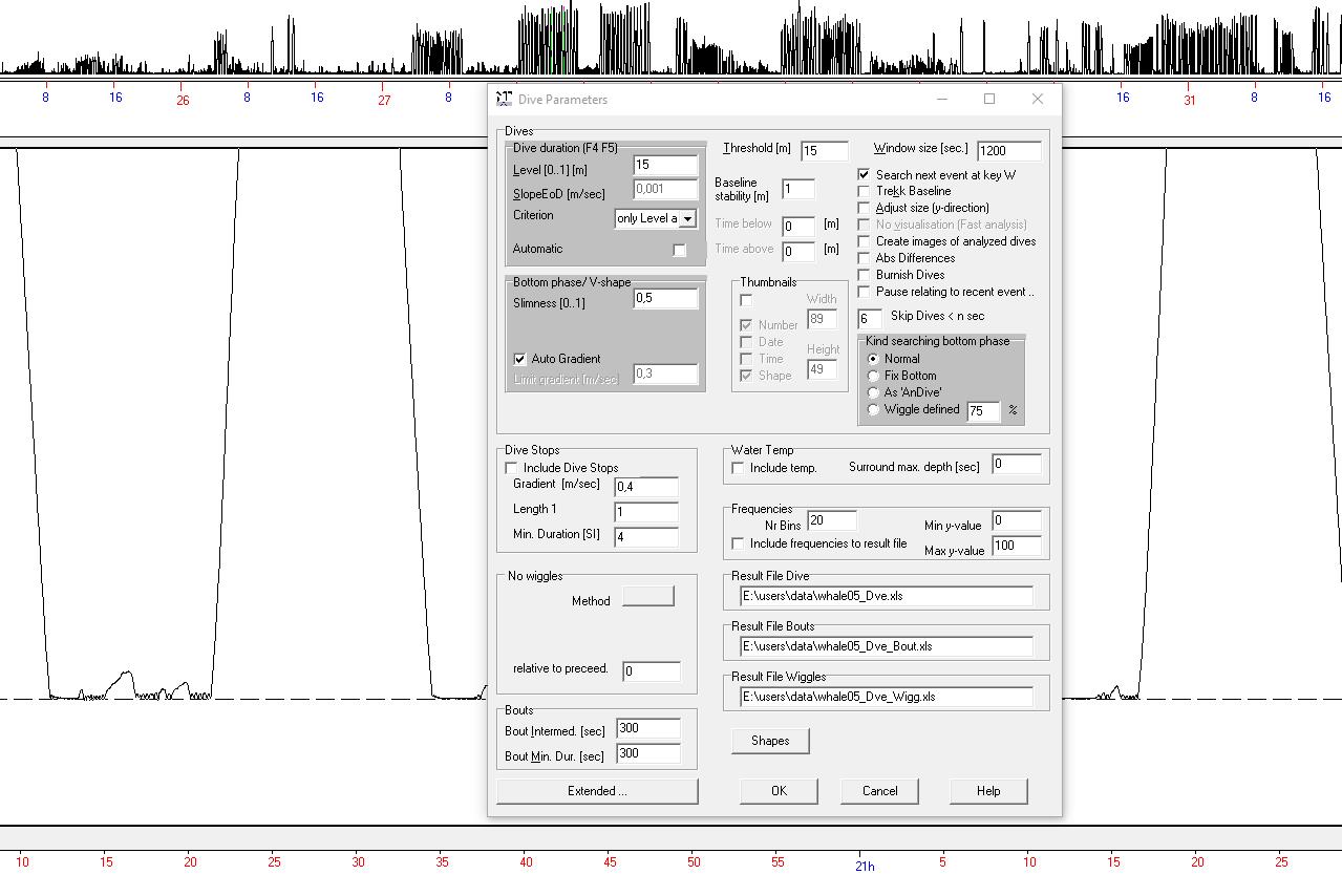 The parameters of the analysis can be changed at any time. Also the cursors, which mark onset and end of the dive (F4 and F5), the cursors, which mark the bottom of the dive (F8, F9) and the baseline.
